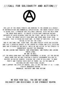 2023: „The last of the Greek forests are burning to the ground as a result of deforestation and commercial exploitation. The Greek fascist State is using this, a problem they willingly created, with the help from the Greek mass media, to create a witch hunt campaign against refugees by again blaming them for the fires. And by this hoping to divide the Greek society even more and spark more right wing violence. This is going on right now, in front of our eyes, as we are trying to put out the fires.
